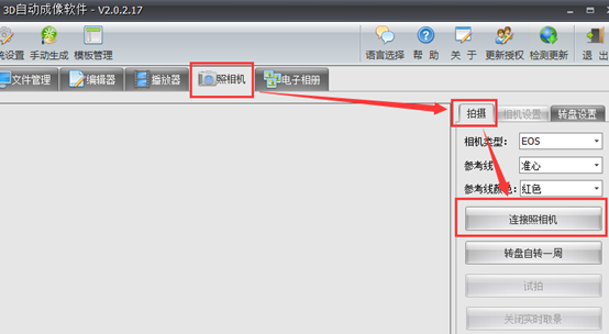 2. 啟動3D自動成像軟件,在“照相機”-“拍攝”選項處點擊“連接照相機”